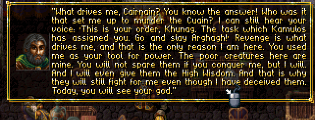 Khunag desires revenge against Cairnain (the current Cuain) at any cost, and after finally reaching the Cuain in Khamulon, he reveals that he was using Tom's party to gain access (and revenge) for his banishment.